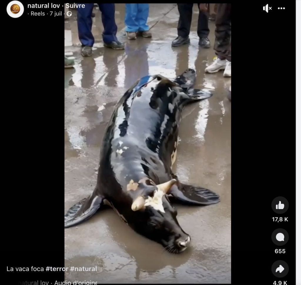 Le 9 juillet 2024, la page Facebook « Le Dakarois 221 » a publié une vidéo de 14 secondes montrant un animal ressemblant à un mélange de poisson et de vache, déchu sur une plage. La séquence est accompagnée du commentaire suivant : « Et si c'était un des signes annonciateurs de la fin du monde ??? ». Cette vidéo est rapidement devenue virale sur les réseaux sociaux, notamment Facebook (1, 2). D’ailleurs, la publication de « Le Dakarois 221 » a été partagé 129 fois le 12 juillet 2024.