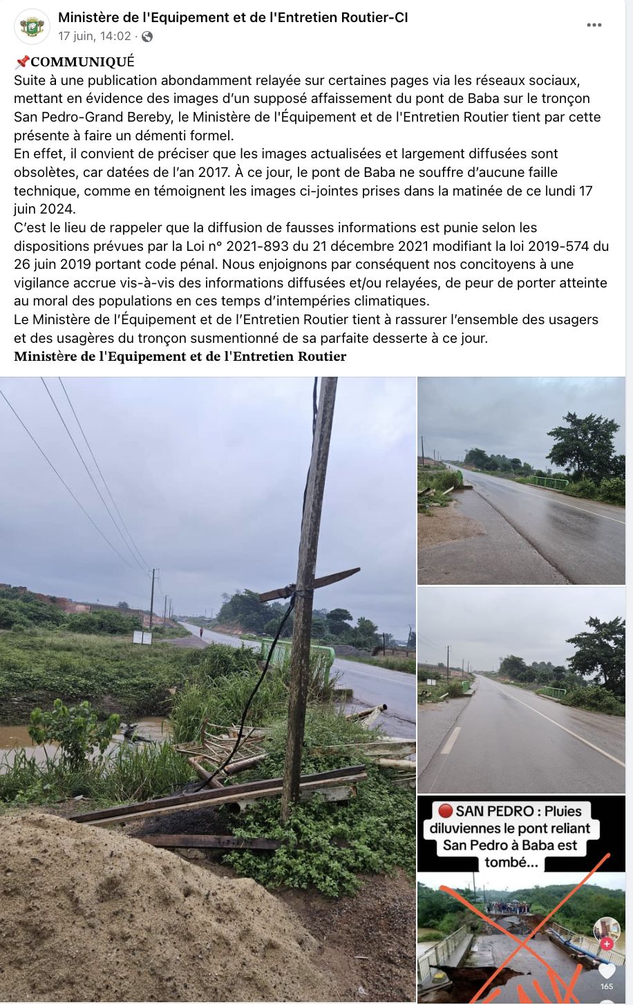 mortes, a annoncé l’Office national ivoirien de la protection civile (ONPC), dans unne publication sur leur page Facebook, le 23 juin 2024. Deux personnes sont portées disparues, emportées par les eaux, précise l’ONPC. C’est dans ce contexte que des images circulent sur les réseaux sociaux et certaines sont présentées comme des preuves des dégâts causés par les inondations récentes. C’est le cas de cette photographie ci-dessous d’un pont en ruine, partagée le 16 juin 2024 par la page Facebook Mali info, avant d’être supprimée. Le post avait déjà été partagée plus 69 fois et a généré plus de 600 mentions « j’aime ». La légende de la publication indique : « SAN PEDRO : Pluies diluviennes Le pont reliant San Pedro à Baba est tombé 🇨🇮 Le Mali est le berceau de l’humanité 🇲🇱 ». La photo a été plusieurs fois partagé sur le même réseau social par d’autres internautes (1, 2, 3, 4, 5). Une image des inondations en Côte d’Ivoire de juin de 2017 Une recherche d’image inversée effectuée avec l’outil de vérification InVID-WeVerify a révélé que cette image a été prise lors des inondations de juin 2017 en Côte d’Ivoire. La photographie, diffusée par plusieurs sites internet, montre le pont reliant San-Pedro à Grand-Béréby (situé dans le sud-ouest de la Côte d’Ivoire) qui avait cédé le 13 juin à la suite de fortes pluies. Cette information a été rapportée par plusieurs médias (1, 2, 3). Démenti du gouvernement ivoirien Sur sa page Facebook, le ministère de l’Équipement et de l’Entretien Routier ivoirien a publié un communiqué pour démentir cette information. Il confirme que l’image que nous vérifions, largement partagée sur internet, est ancienne et date de juin 2017. « Suite à une publication abondamment relayée sur certaines pages via les réseaux sociaux, mettant en évidence des images d’un supposé affaissement du pont de Baba sur le tronçon San Pedro-Grand Bereby, le ministère de l’Équipement et de l’Entretien Routier tient par la présente à faire un démenti formel. En effet, il convient de préciser que les images actualisées et largement diffusées sont obsolètes, car datées de 2017. À ce jour, le pont de Baba ne souffre d’aucune faille technique, comme en témoignent les images ci-jointes prises dans la matinée de ce lundi 17 juin 2024. » De plus, il a partagé des photos de l’état actuel du pont de Baba sur le tronçon San Pedro-Grand Bereby, prises le 17 juin 2024. Ces images montrent que le pont est en bon état.