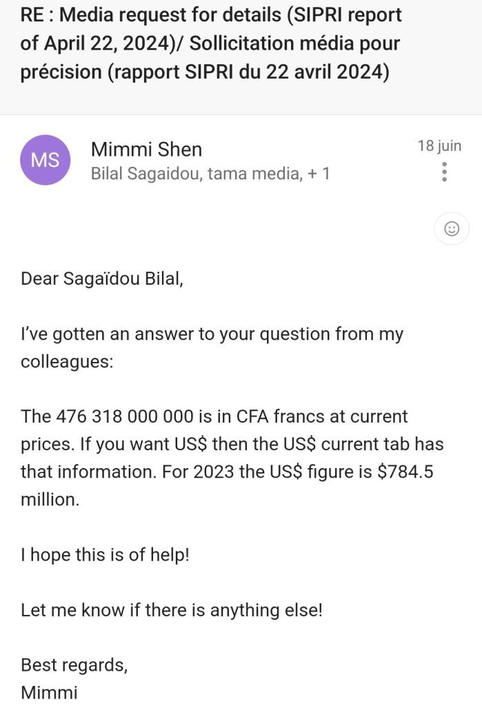 Avant de boucler la rédaction de cette enquête, nous avons contacté, le 28 juin 2024, la Directrice du quotidien Nouvel Horizon, pour lui demander de nous fournir la documentation exploitée du Sipri, ou nous mettre en contact avec le journaliste ayant rédigé le texte incriminé ou encore nous donner des éventuelles explications. Parce que, a-t-on expliqué, « après investigation, il s'avère que ces chiffres avancés dans votre article ne sont pas corrects et, par conséquent, ils sont faussement attribués au Stockholm international peace research institute ».